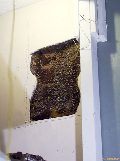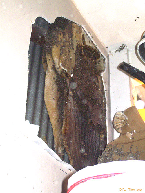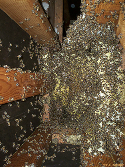 If bees in a wall are killed but the nest is not removed, the combs are no longer ventilated and wax and honey may melt and stain interior walls — the honey also attracts ants, cockroaches, mice, and rats.
